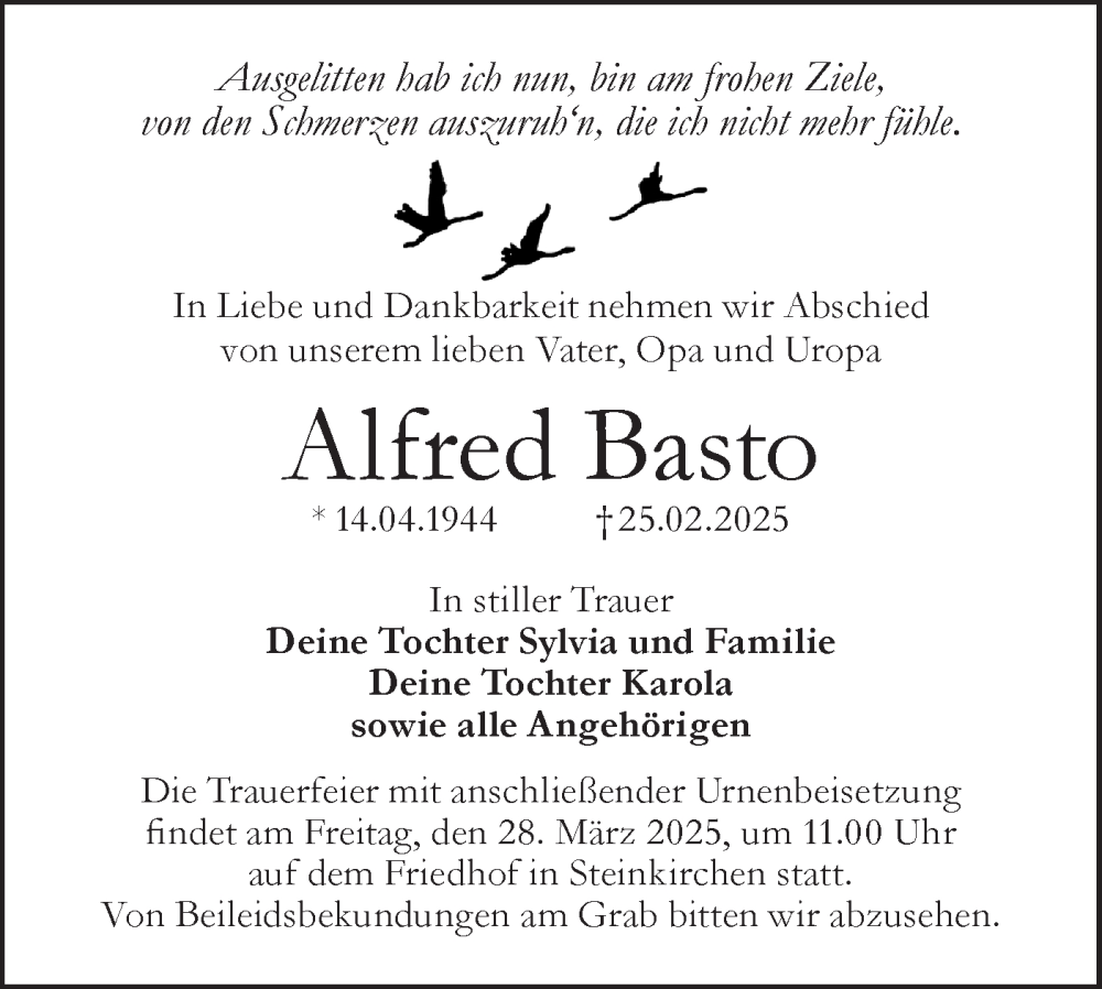 Hier finden Sie alle Traueranzeigen aus der Zeitung, die bisher für Alfred Basto erschienen sind. Weitere Traueranzeigen, die in der Zeitung erscheinen, werden hier ebenfalls aufgelistet