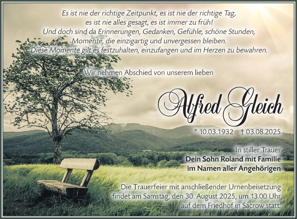 Hier finden Sie alle Traueranzeigen aus der Zeitung, die bisher für Alfred Gleich erschienen sind. Weitere Traueranzeigen, die in der Zeitung erscheinen, werden hier ebenfalls aufgelistet