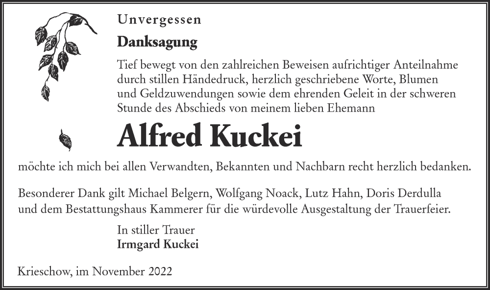 Hier finden Sie alle Traueranzeigen aus der Zeitung, die bisher für Alfred Kuckei erschienen sind. Weitere Traueranzeigen, die in der Zeitung erscheinen, werden hier ebenfalls aufgelistet
