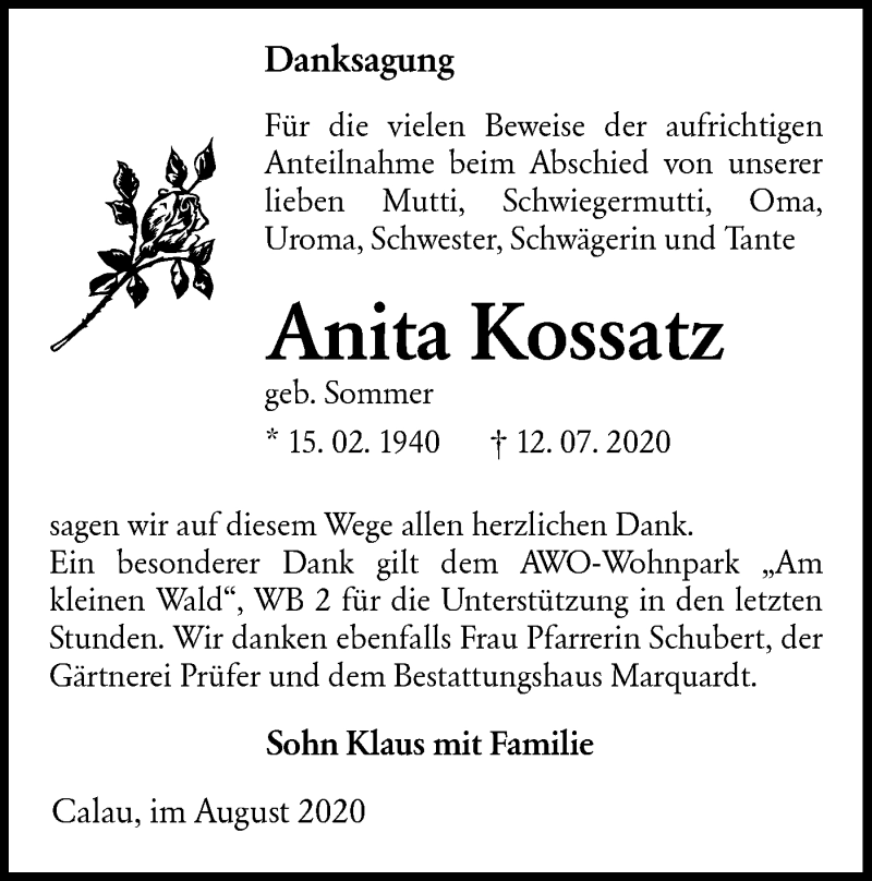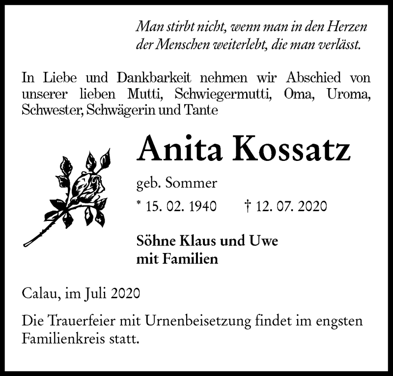 Hier finden Sie alle Traueranzeigen aus der Zeitung, die bisher für Anita Kossatz erschienen sind. Weitere Traueranzeigen, die in der Zeitung erscheinen, werden hier ebenfalls aufgelistet