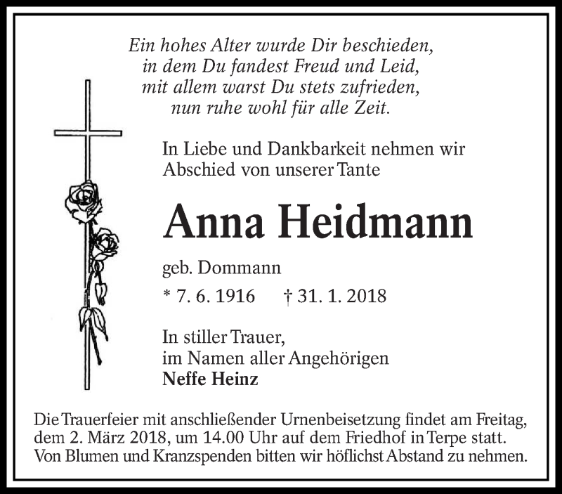 Hier finden Sie alle Traueranzeigen aus der Zeitung, die bisher für Anna Heidmann erschienen sind. Weitere Traueranzeigen, die in der Zeitung erscheinen, werden hier ebenfalls aufgelistet