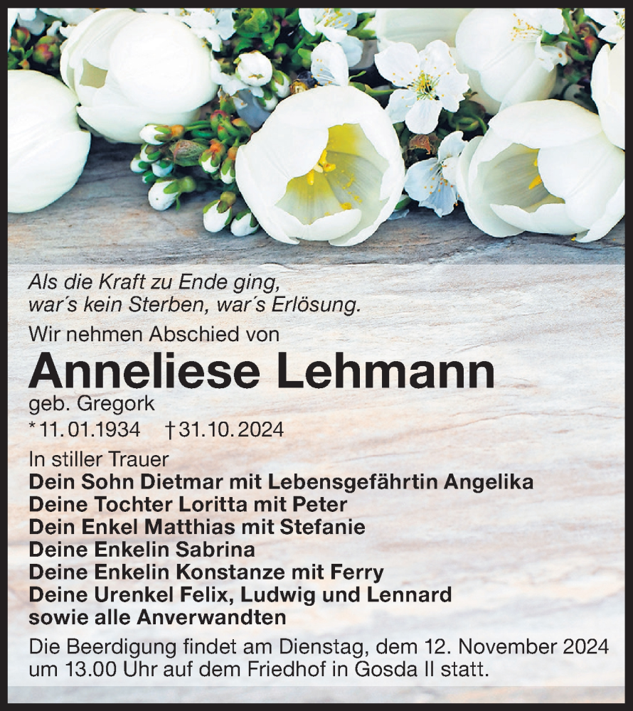 Hier finden Sie alle Traueranzeigen aus der Zeitung, die bisher für Anneliese Lehmann erschienen sind. Weitere Traueranzeigen, die in der Zeitung erscheinen, werden hier ebenfalls aufgelistet