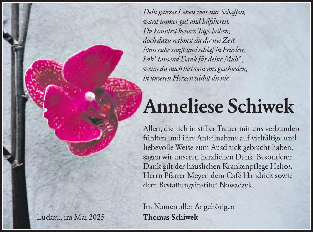 Hier finden Sie alle Traueranzeigen aus der Zeitung, die bisher für Anneliese Schiwek erschienen sind. Weitere Traueranzeigen, die in der Zeitung erscheinen, werden hier ebenfalls aufgelistet