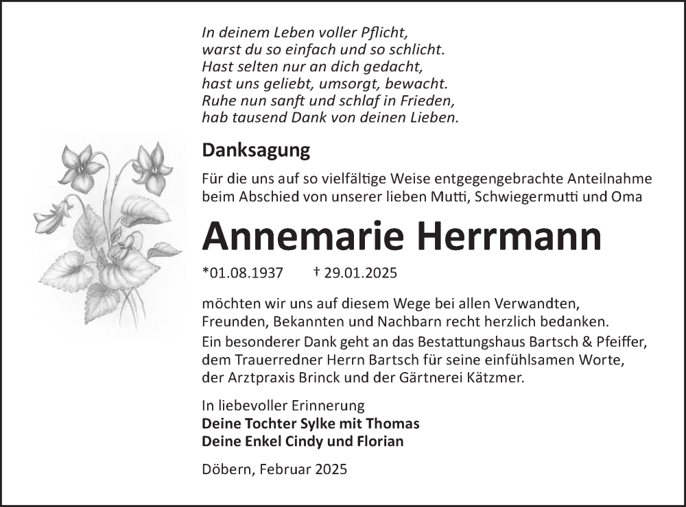 Hier finden Sie alle Traueranzeigen aus der Zeitung, die bisher für Annemarie Herrmann erschienen sind. Weitere Traueranzeigen, die in der Zeitung erscheinen, werden hier ebenfalls aufgelistet