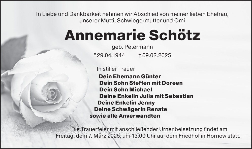 Hier finden Sie alle Traueranzeigen aus der Zeitung, die bisher für Annemarie Schötz erschienen sind. Weitere Traueranzeigen, die in der Zeitung erscheinen, werden hier ebenfalls aufgelistet
