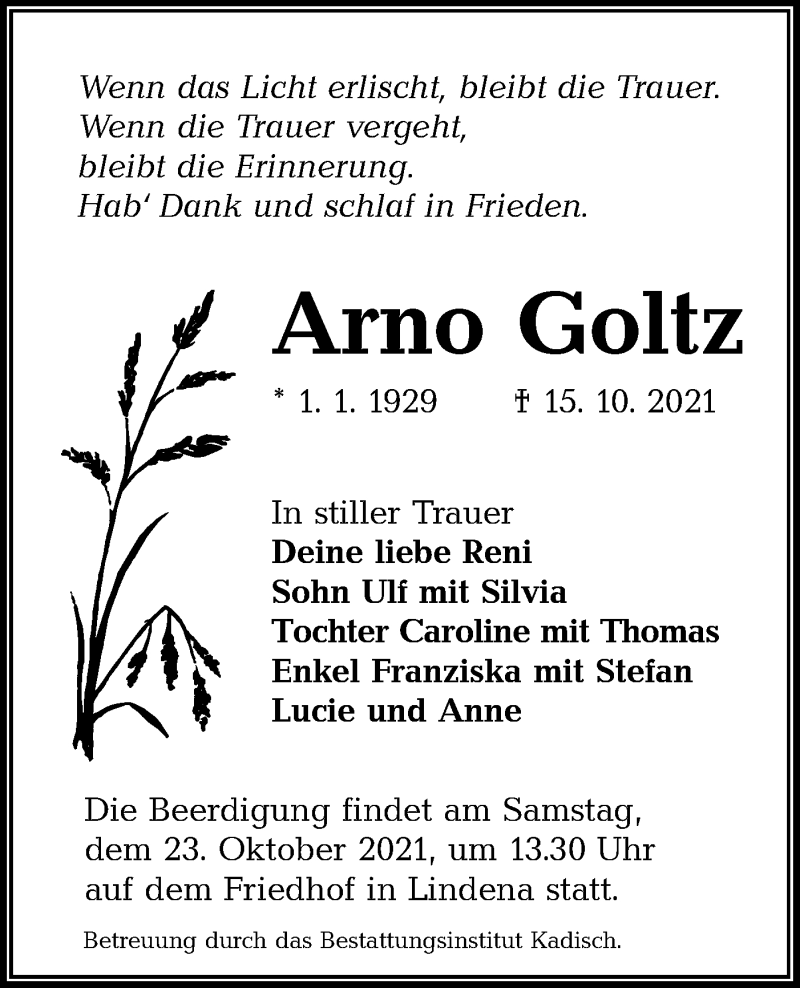 Hier finden Sie alle Traueranzeigen aus der Zeitung, die bisher für Arno Goltz erschienen sind. Weitere Traueranzeigen, die in der Zeitung erscheinen, werden hier ebenfalls aufgelistet
