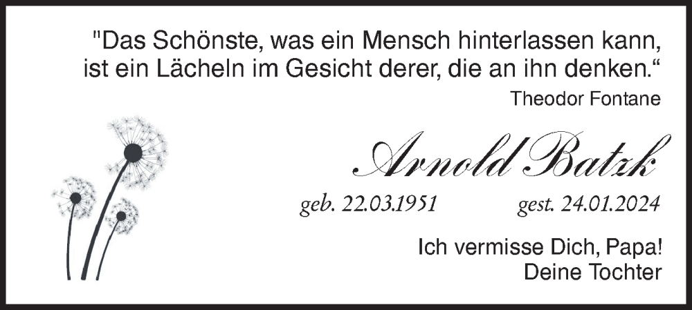 Hier finden Sie alle Traueranzeigen aus der Zeitung, die bisher für Arnold Batzk erschienen sind. Weitere Traueranzeigen, die in der Zeitung erscheinen, werden hier ebenfalls aufgelistet