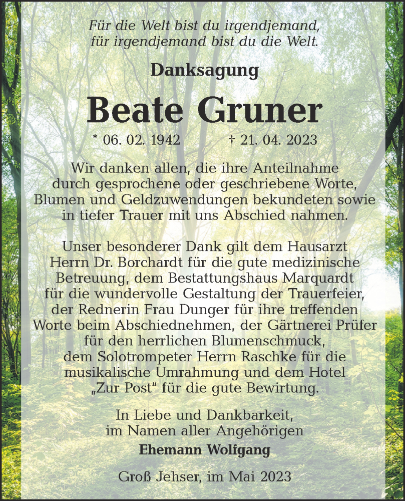 Hier finden Sie alle Traueranzeigen aus der Zeitung, die bisher für Beate Gruner erschienen sind. Weitere Traueranzeigen, die in der Zeitung erscheinen, werden hier ebenfalls aufgelistet