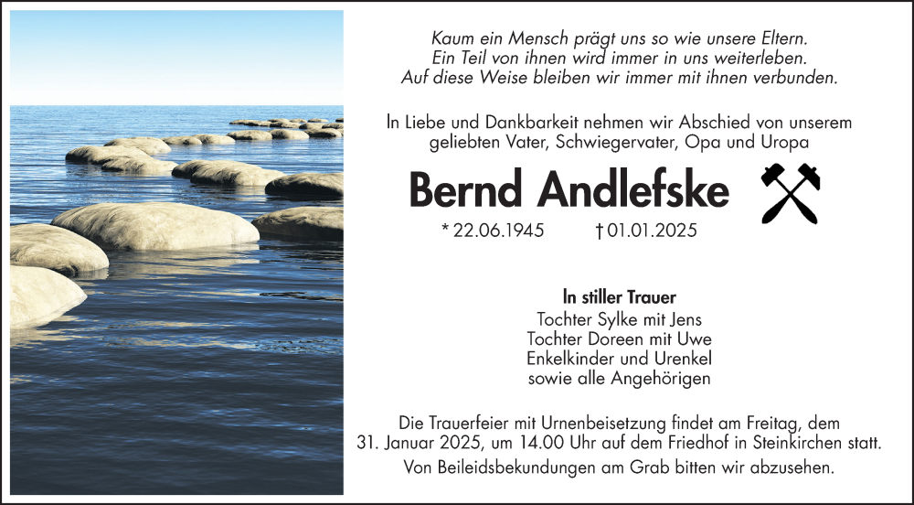 Hier finden Sie alle Traueranzeigen aus der Zeitung, die bisher für Bernd Andlefske erschienen sind. Weitere Traueranzeigen, die in der Zeitung erscheinen, werden hier ebenfalls aufgelistet