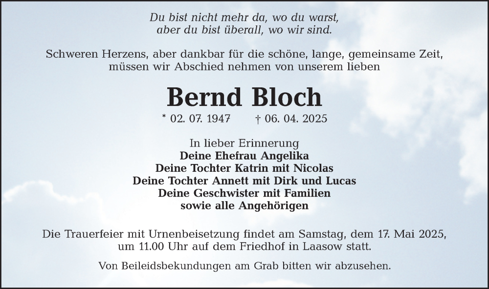 Hier finden Sie alle Traueranzeigen aus der Zeitung, die bisher für Bernd Bloch erschienen sind. Weitere Traueranzeigen, die in der Zeitung erscheinen, werden hier ebenfalls aufgelistet