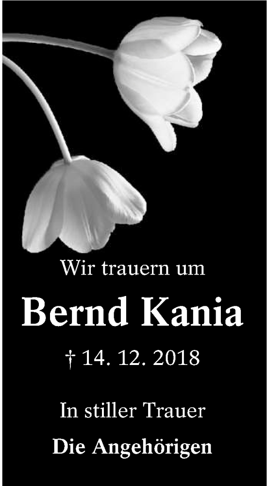 Hier finden Sie alle Traueranzeigen aus der Zeitung, die bisher für Bernd Kania erschienen sind. Weitere Traueranzeigen, die in der Zeitung erscheinen, werden hier ebenfalls aufgelistet