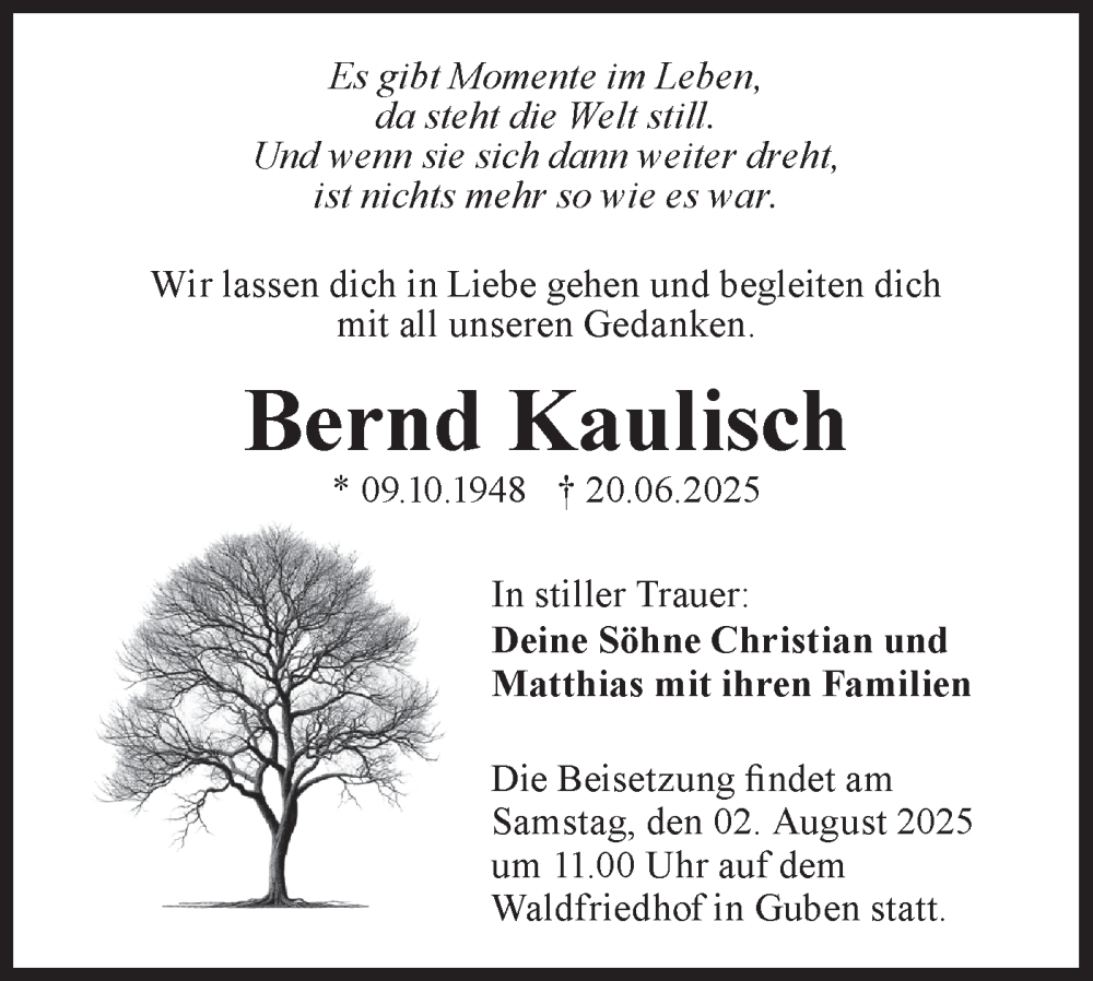 Hier finden Sie alle Traueranzeigen aus der Zeitung, die bisher für Bernd Kaulisch erschienen sind. Weitere Traueranzeigen, die in der Zeitung erscheinen, werden hier ebenfalls aufgelistet
