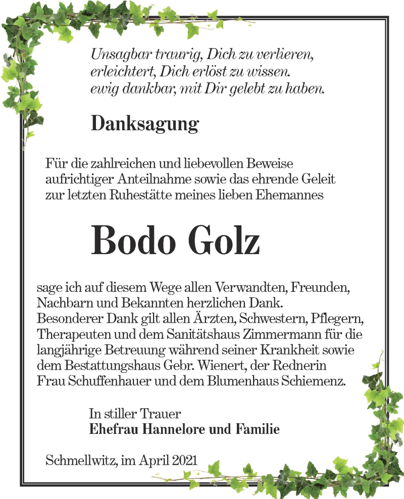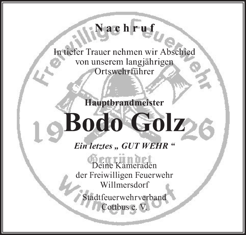 Hier finden Sie alle Traueranzeigen aus der Zeitung, die bisher für Bodo Golz erschienen sind. Weitere Traueranzeigen, die in der Zeitung erscheinen, werden hier ebenfalls aufgelistet
