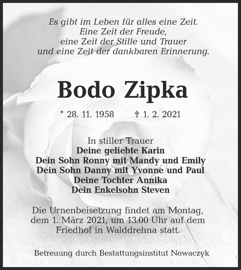 Hier finden Sie alle Traueranzeigen aus der Zeitung, die bisher für Bodo Zipka erschienen sind. Weitere Traueranzeigen, die in der Zeitung erscheinen, werden hier ebenfalls aufgelistet