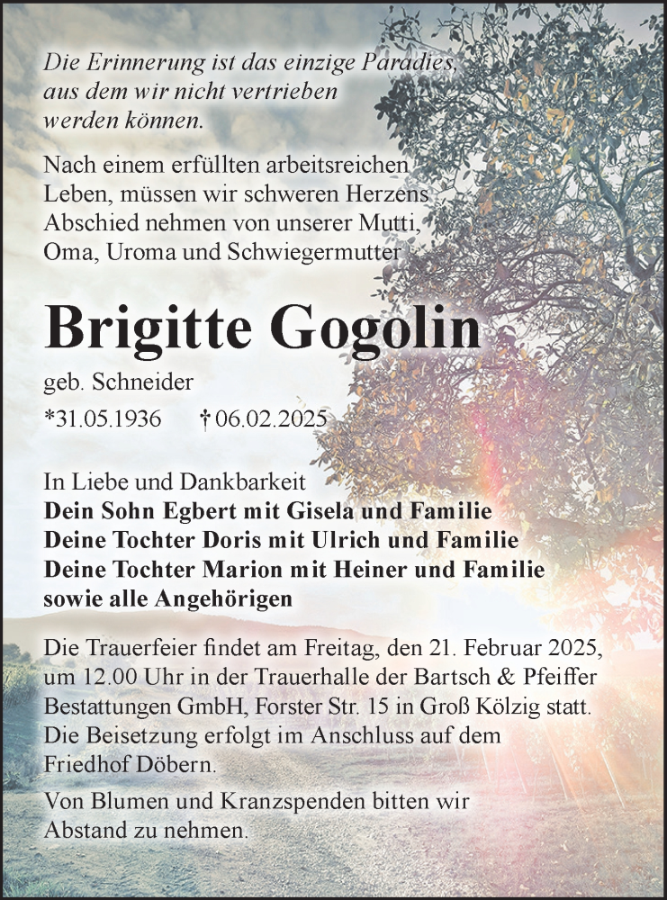 Hier finden Sie alle Traueranzeigen aus der Zeitung, die bisher für Brigitte Gogolin erschienen sind. Weitere Traueranzeigen, die in der Zeitung erscheinen, werden hier ebenfalls aufgelistet