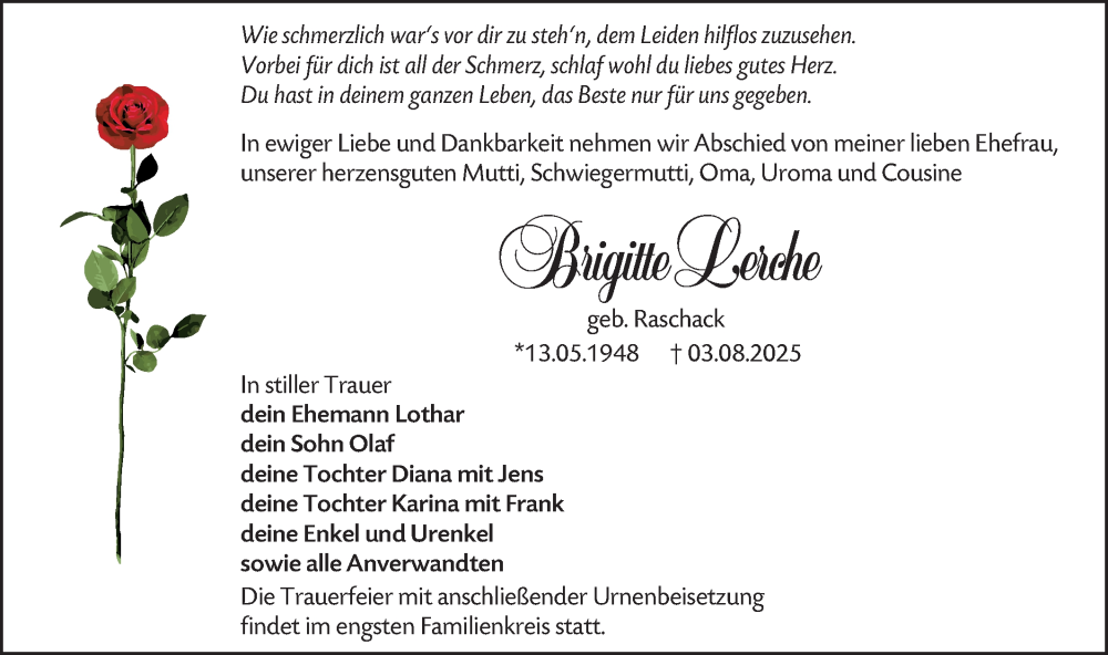 Hier finden Sie alle Traueranzeigen aus der Zeitung, die bisher für Brigitte Lerche erschienen sind. Weitere Traueranzeigen, die in der Zeitung erscheinen, werden hier ebenfalls aufgelistet