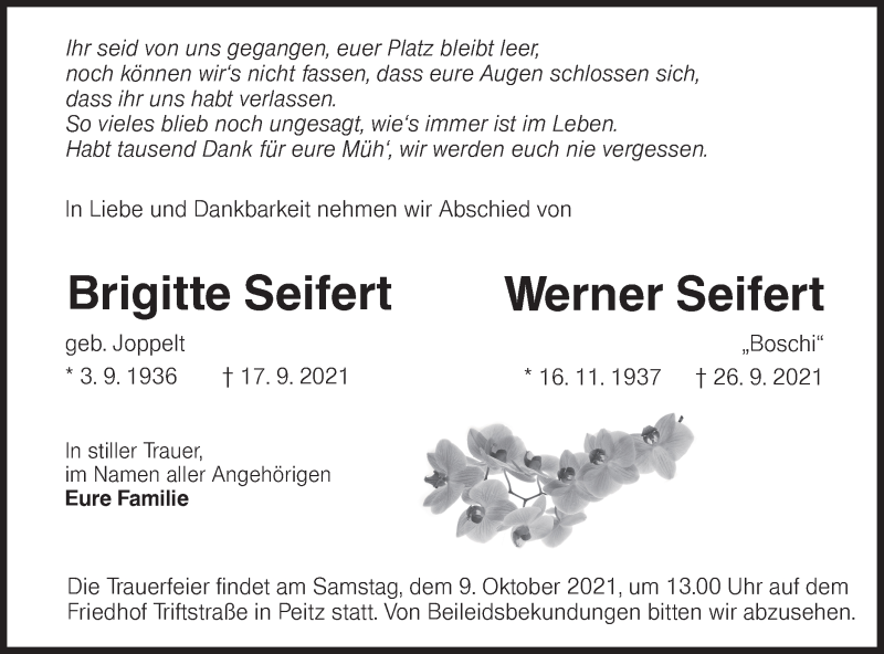 Hier finden Sie alle Traueranzeigen aus der Zeitung, die bisher für Brigitte und Werner Seifert erschienen sind. Weitere Traueranzeigen, die in der Zeitung erscheinen, werden hier ebenfalls aufgelistet