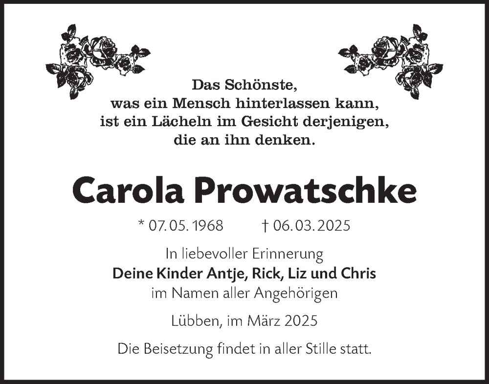 Hier finden Sie alle Traueranzeigen aus der Zeitung, die bisher für Carola Prowatschke erschienen sind. Weitere Traueranzeigen, die in der Zeitung erscheinen, werden hier ebenfalls aufgelistet