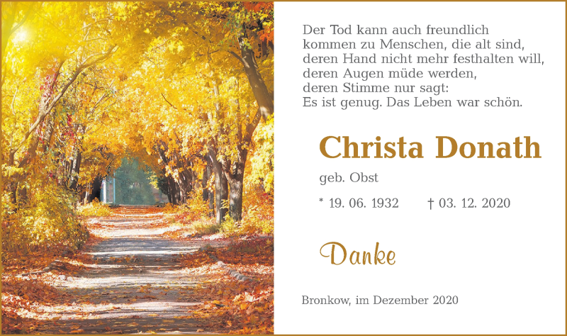 Hier finden Sie alle Traueranzeigen aus der Zeitung, die bisher für Christa Donath erschienen sind. Weitere Traueranzeigen, die in der Zeitung erscheinen, werden hier ebenfalls aufgelistet
