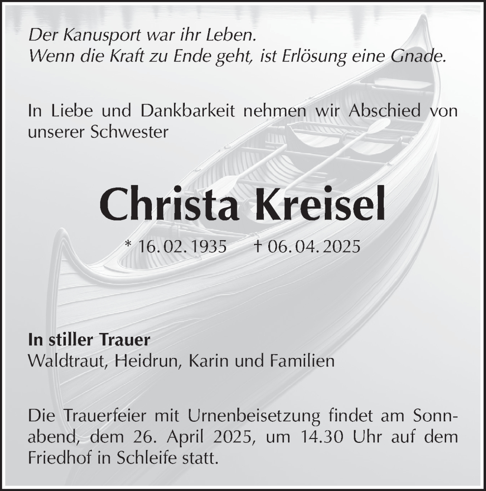 Hier finden Sie alle Traueranzeigen aus der Zeitung, die bisher für Christa Kreisel erschienen sind. Weitere Traueranzeigen, die in der Zeitung erscheinen, werden hier ebenfalls aufgelistet