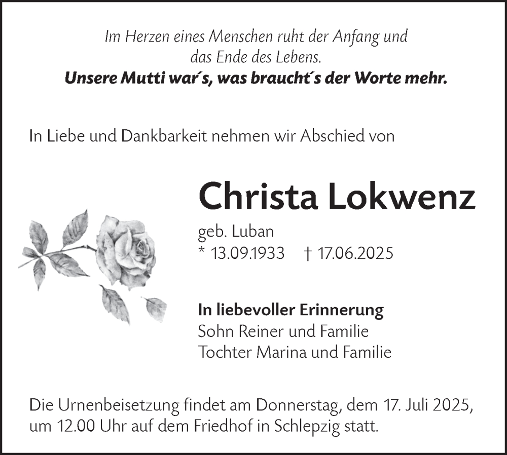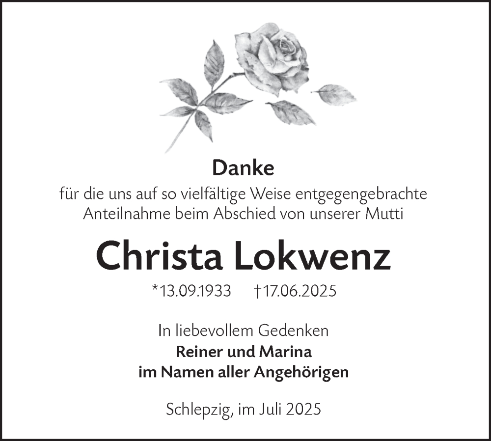 Hier finden Sie alle Traueranzeigen aus der Zeitung, die bisher für Christa Lokwenz erschienen sind. Weitere Traueranzeigen, die in der Zeitung erscheinen, werden hier ebenfalls aufgelistet