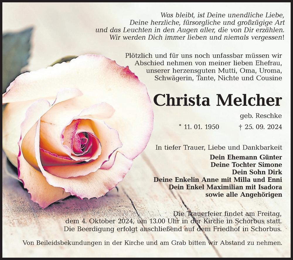 Hier finden Sie alle Traueranzeigen aus der Zeitung, die bisher für Christa Melcher erschienen sind. Weitere Traueranzeigen, die in der Zeitung erscheinen, werden hier ebenfalls aufgelistet