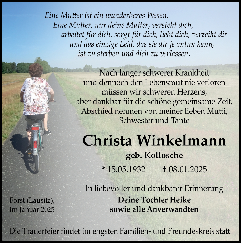 Hier finden Sie alle Traueranzeigen aus der Zeitung, die bisher für Christa Winkelmann erschienen sind. Weitere Traueranzeigen, die in der Zeitung erscheinen, werden hier ebenfalls aufgelistet