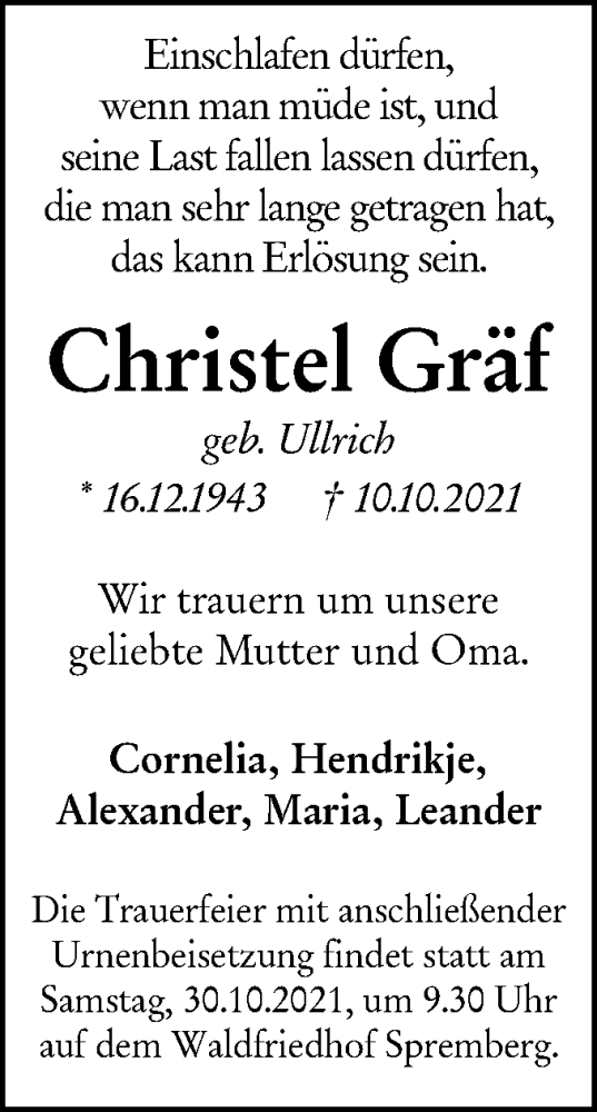 Hier finden Sie alle Traueranzeigen aus der Zeitung, die bisher für Christel Gräf erschienen sind. Weitere Traueranzeigen, die in der Zeitung erscheinen, werden hier ebenfalls aufgelistet