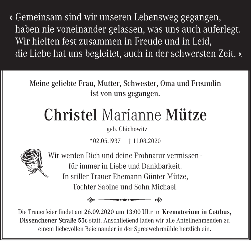 Hier finden Sie alle Traueranzeigen aus der Zeitung, die bisher für Christel Marianne Mütze erschienen sind. Weitere Traueranzeigen, die in der Zeitung erscheinen, werden hier ebenfalls aufgelistet