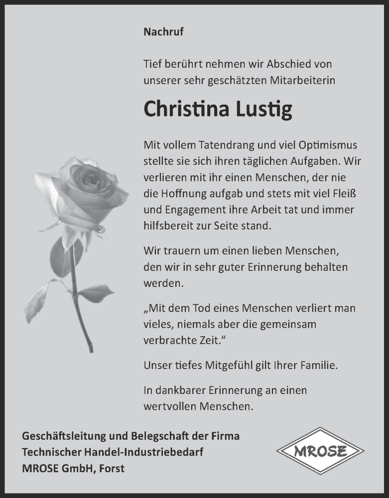 Hier finden Sie alle Traueranzeigen aus der Zeitung, die bisher für Christina Lustig erschienen sind. Weitere Traueranzeigen, die in der Zeitung erscheinen, werden hier ebenfalls aufgelistet