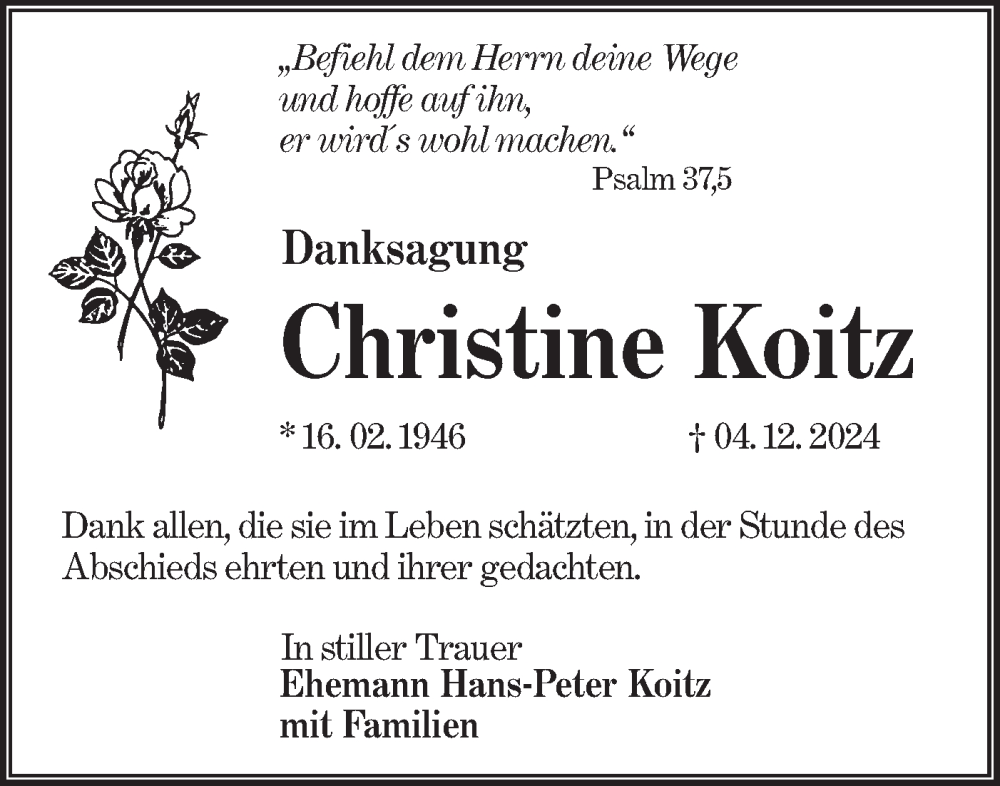 Hier finden Sie alle Traueranzeigen aus der Zeitung, die bisher für Christine Koitz erschienen sind. Weitere Traueranzeigen, die in der Zeitung erscheinen, werden hier ebenfalls aufgelistet