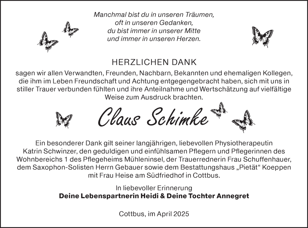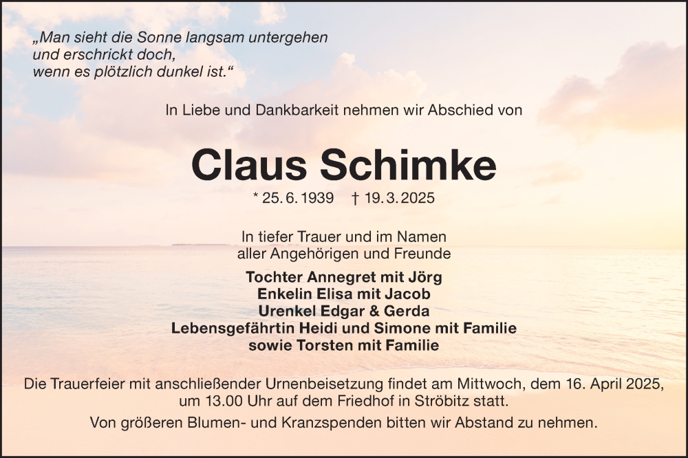 Hier finden Sie alle Traueranzeigen aus der Zeitung, die bisher für Claus Schimke erschienen sind. Weitere Traueranzeigen, die in der Zeitung erscheinen, werden hier ebenfalls aufgelistet