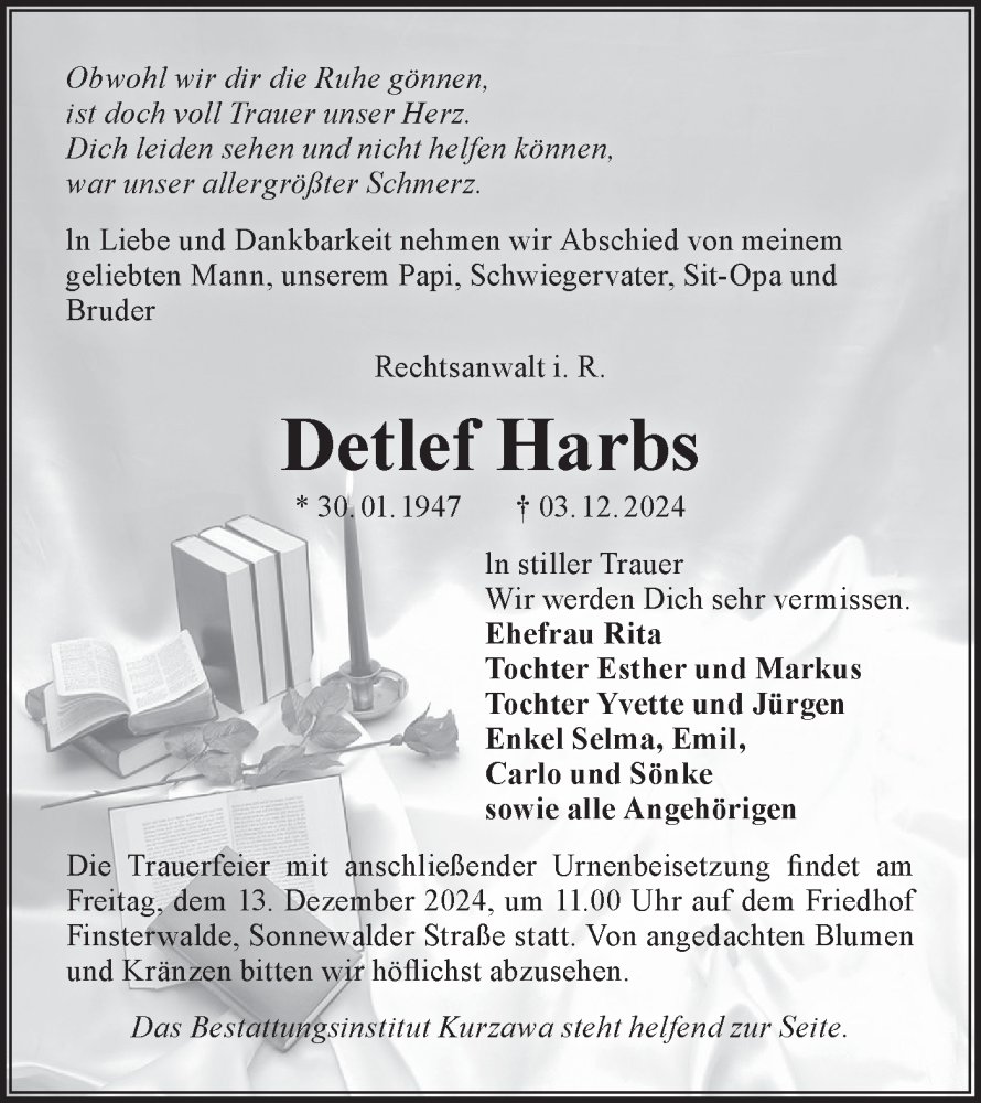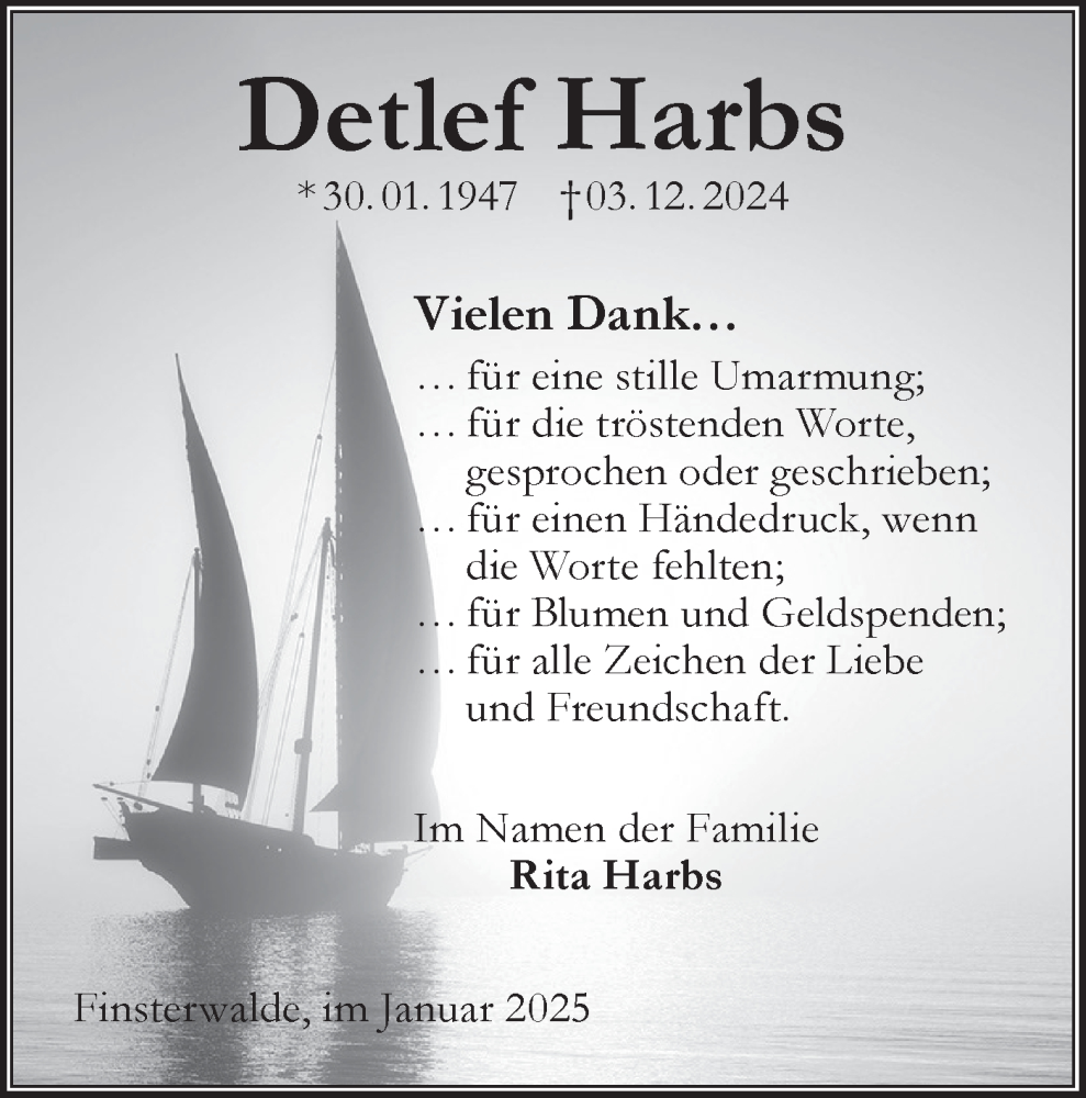 Hier finden Sie alle Traueranzeigen aus der Zeitung, die bisher für Detlef Harbs erschienen sind. Weitere Traueranzeigen, die in der Zeitung erscheinen, werden hier ebenfalls aufgelistet