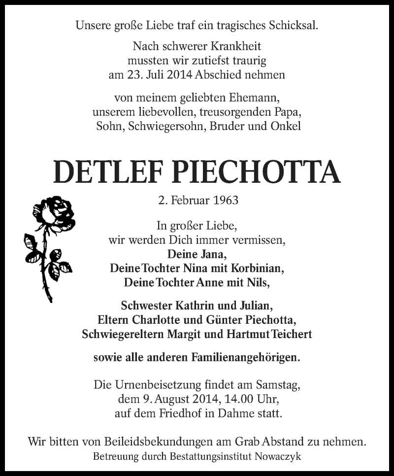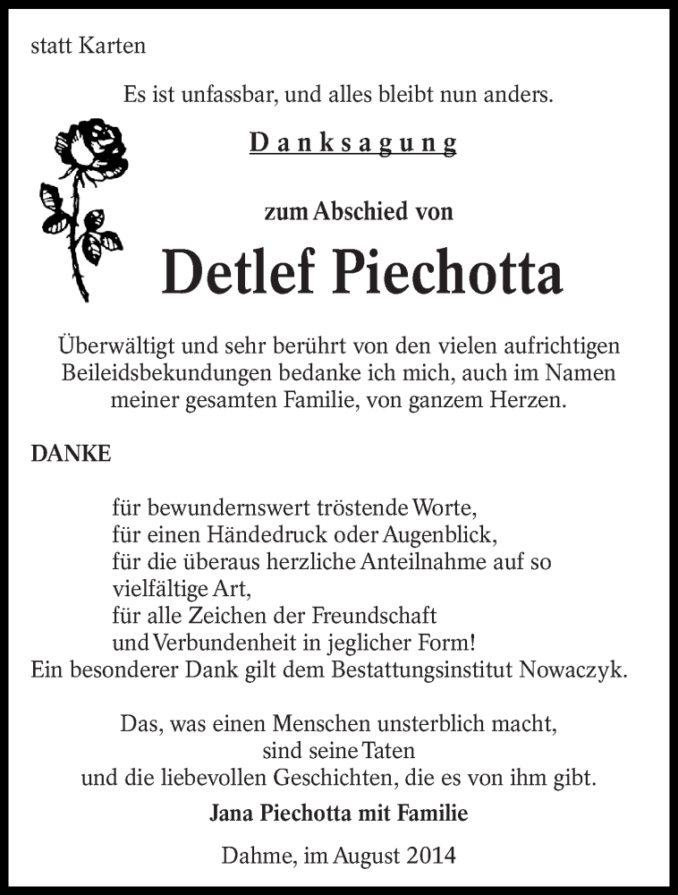 Hier finden Sie alle Traueranzeigen aus der Zeitung, die bisher für Detlef Piechotta erschienen sind. Weitere Traueranzeigen, die in der Zeitung erscheinen, werden hier ebenfalls aufgelistet