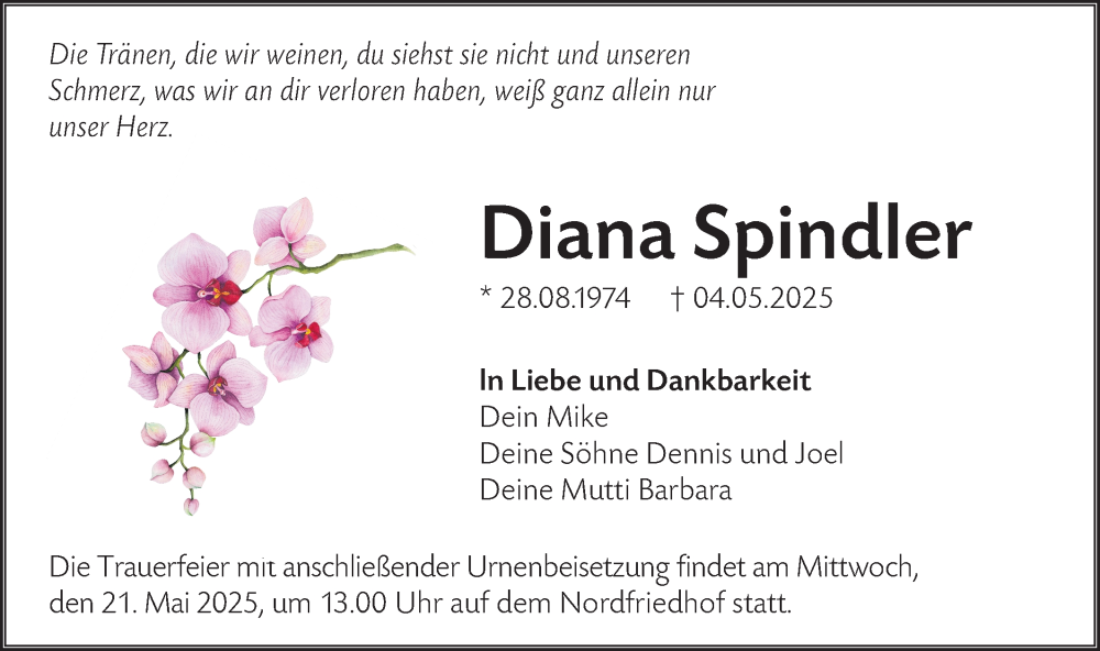 Hier finden Sie alle Traueranzeigen aus der Zeitung, die bisher für Diana Spindler erschienen sind. Weitere Traueranzeigen, die in der Zeitung erscheinen, werden hier ebenfalls aufgelistet