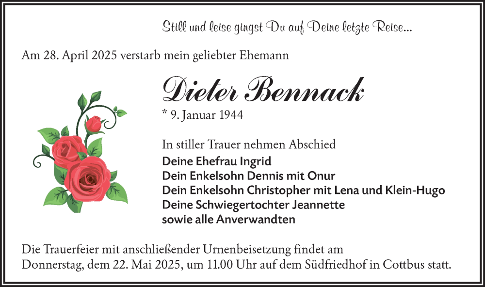 Hier finden Sie alle Traueranzeigen aus der Zeitung, die bisher für Dieter Bennack erschienen sind. Weitere Traueranzeigen, die in der Zeitung erscheinen, werden hier ebenfalls aufgelistet