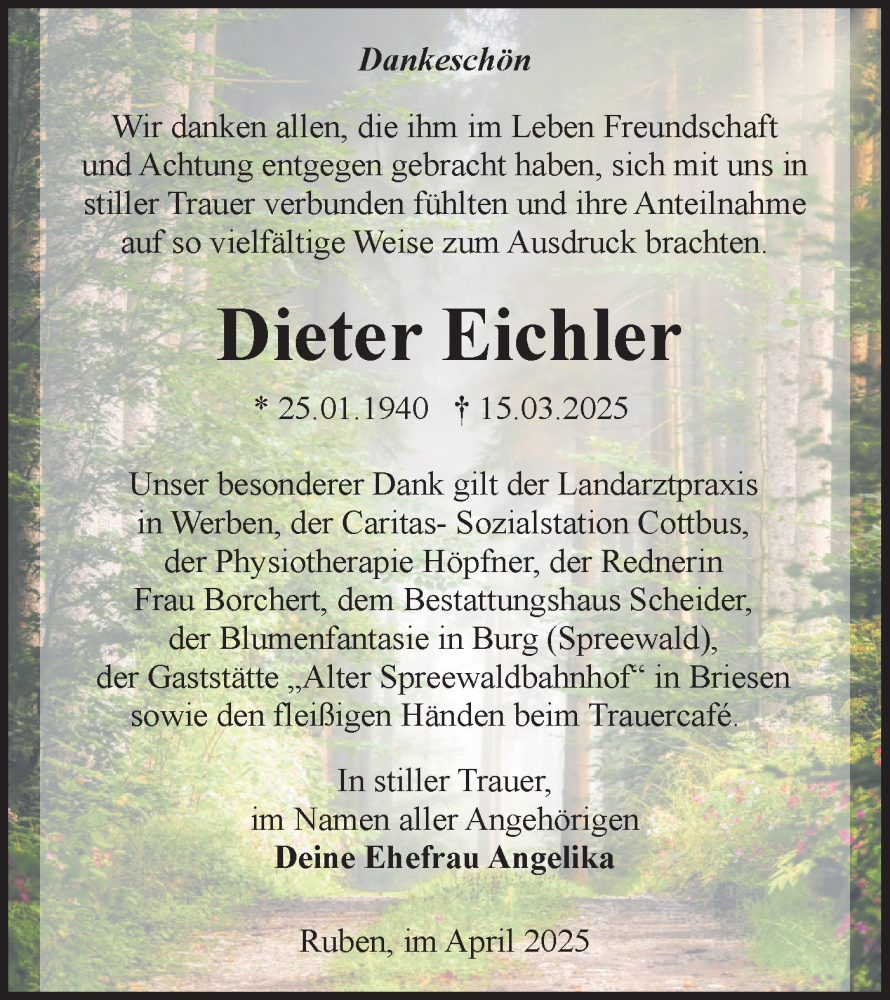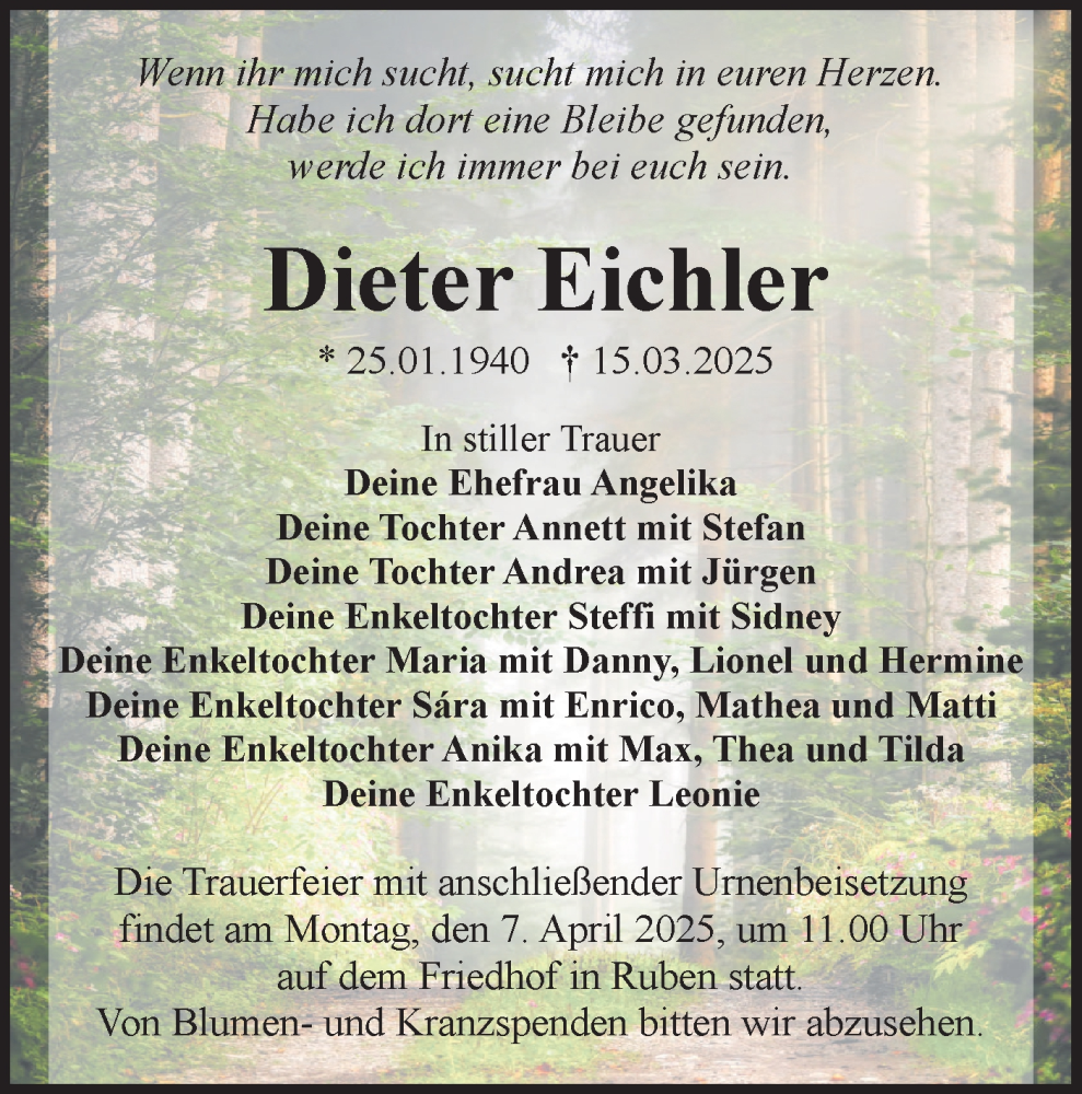 Hier finden Sie alle Traueranzeigen aus der Zeitung, die bisher für Dieter Eichler erschienen sind. Weitere Traueranzeigen, die in der Zeitung erscheinen, werden hier ebenfalls aufgelistet