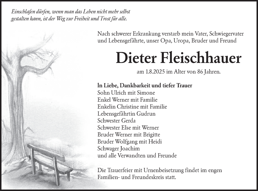Hier finden Sie alle Traueranzeigen aus der Zeitung, die bisher für Dieter Fleischhauer erschienen sind. Weitere Traueranzeigen, die in der Zeitung erscheinen, werden hier ebenfalls aufgelistet