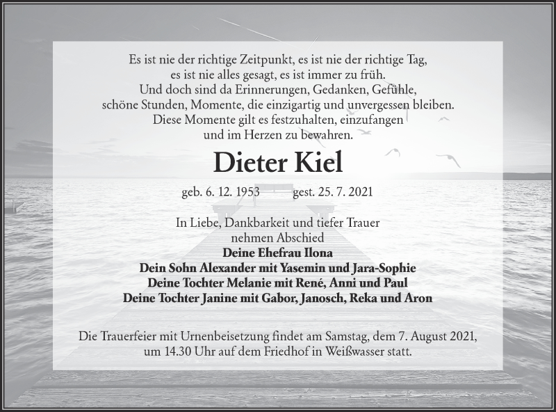 Hier finden Sie alle Traueranzeigen aus der Zeitung, die bisher für Dieter Kiel erschienen sind. Weitere Traueranzeigen, die in der Zeitung erscheinen, werden hier ebenfalls aufgelistet