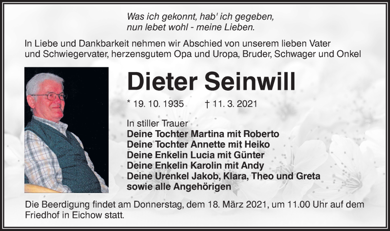 Hier finden Sie alle Traueranzeigen aus der Zeitung, die bisher für Dieter Seinwill erschienen sind. Weitere Traueranzeigen, die in der Zeitung erscheinen, werden hier ebenfalls aufgelistet