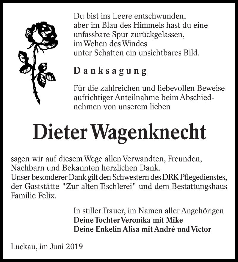 Hier finden Sie alle Traueranzeigen aus der Zeitung, die bisher für Dieter Wagenknecht erschienen sind. Weitere Traueranzeigen, die in der Zeitung erscheinen, werden hier ebenfalls aufgelistet