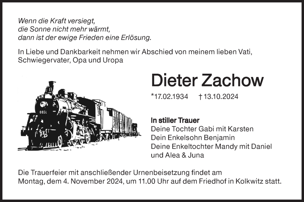 Hier finden Sie alle Traueranzeigen aus der Zeitung, die bisher für Dieter Zachow erschienen sind. Weitere Traueranzeigen, die in der Zeitung erscheinen, werden hier ebenfalls aufgelistet