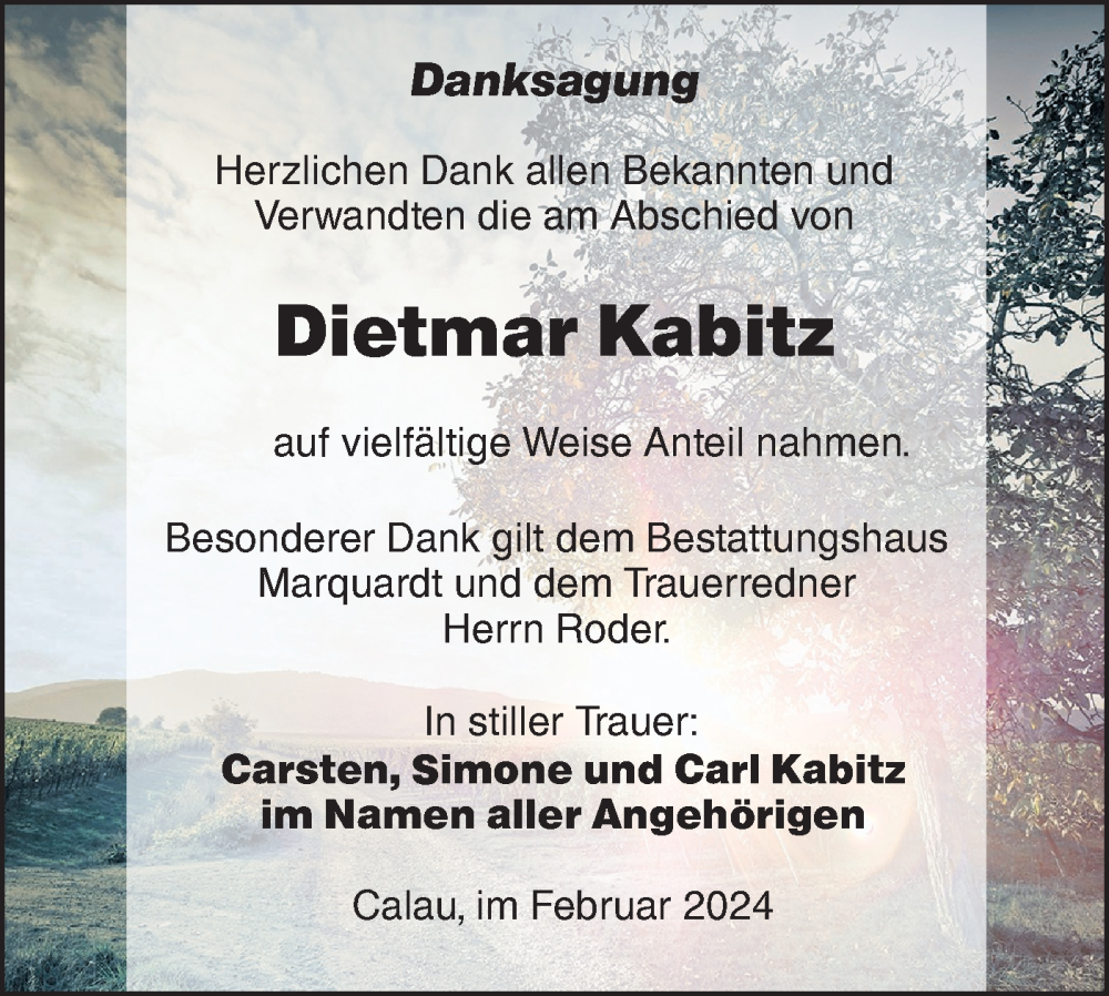 Hier finden Sie alle Traueranzeigen aus der Zeitung, die bisher für Dietmar Kabitz erschienen sind. Weitere Traueranzeigen, die in der Zeitung erscheinen, werden hier ebenfalls aufgelistet
