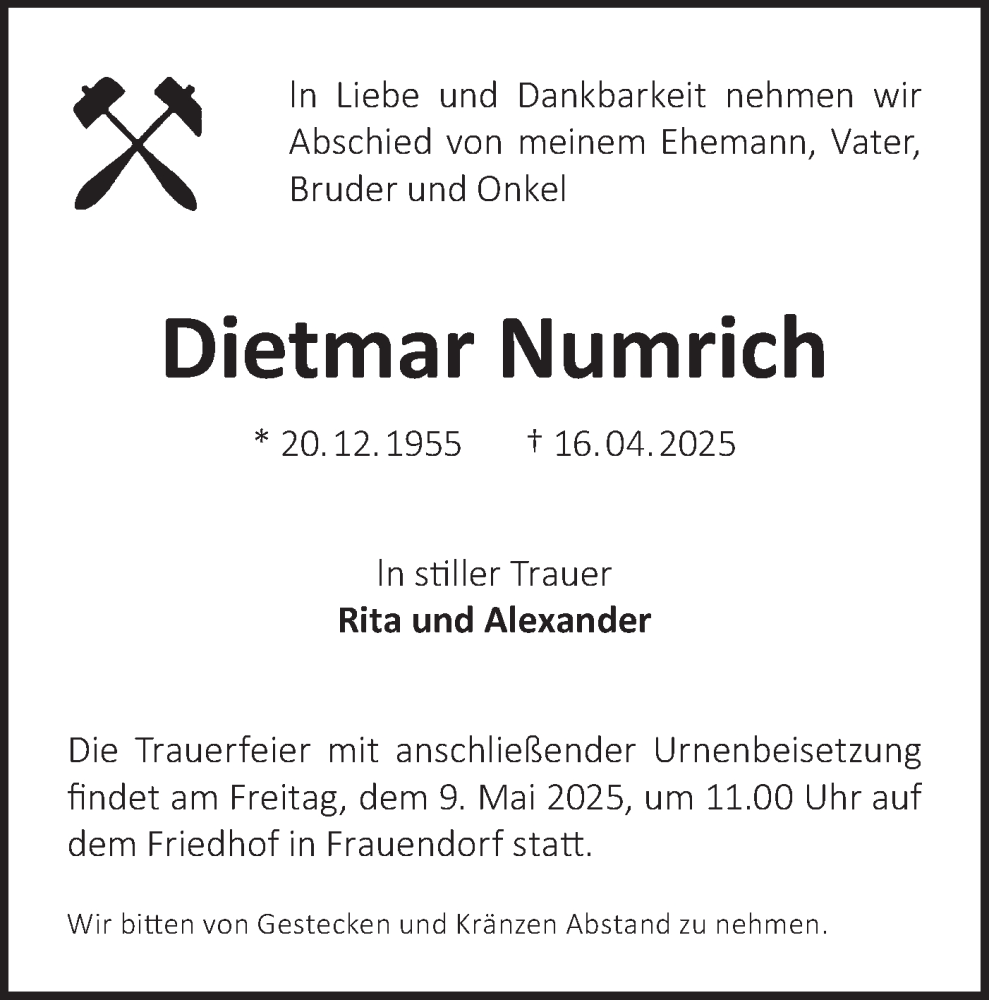 Hier finden Sie alle Traueranzeigen aus der Zeitung, die bisher für Dietmar Numrich erschienen sind. Weitere Traueranzeigen, die in der Zeitung erscheinen, werden hier ebenfalls aufgelistet