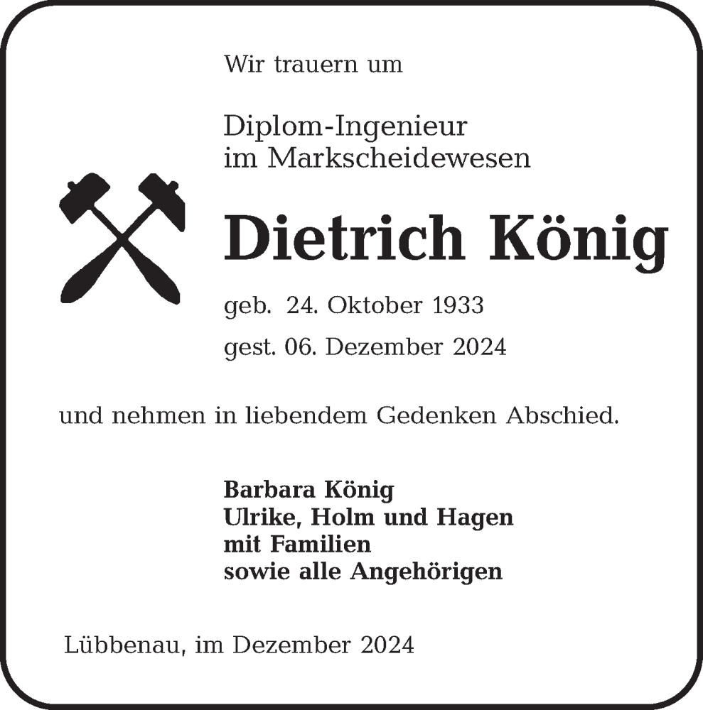 Hier finden Sie alle Traueranzeigen aus der Zeitung, die bisher für Dietrich König erschienen sind. Weitere Traueranzeigen, die in der Zeitung erscheinen, werden hier ebenfalls aufgelistet