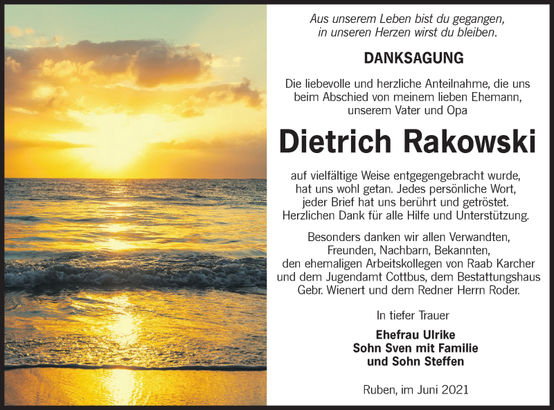 Hier finden Sie alle Traueranzeigen aus der Zeitung, die bisher für Dietrich Rakowski erschienen sind. Weitere Traueranzeigen, die in der Zeitung erscheinen, werden hier ebenfalls aufgelistet