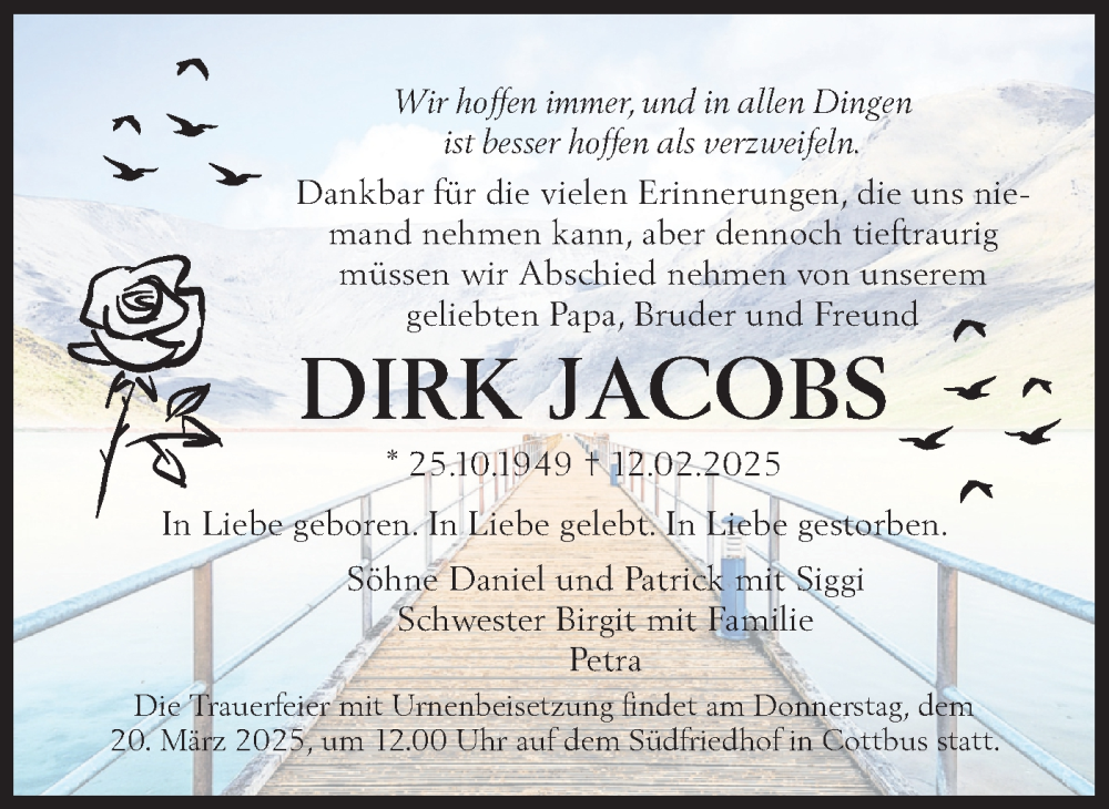 Hier finden Sie alle Traueranzeigen aus der Zeitung, die bisher für Dirk Jacobs erschienen sind. Weitere Traueranzeigen, die in der Zeitung erscheinen, werden hier ebenfalls aufgelistet