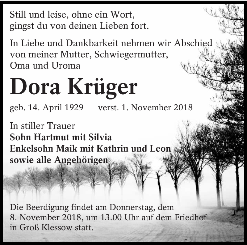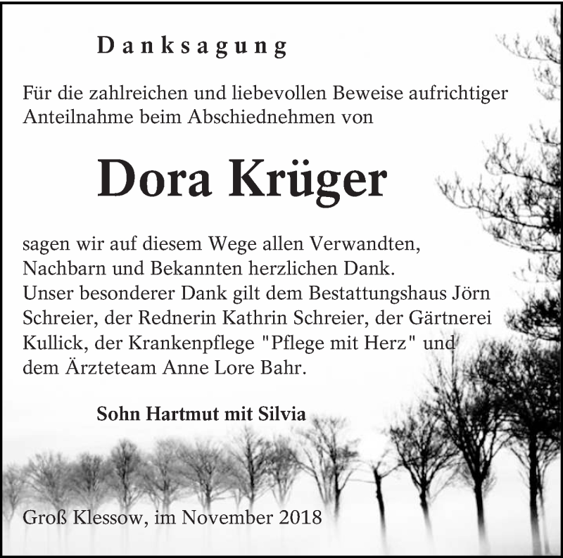 Hier finden Sie alle Traueranzeigen aus der Zeitung, die bisher für Dora Krüger erschienen sind. Weitere Traueranzeigen, die in der Zeitung erscheinen, werden hier ebenfalls aufgelistet