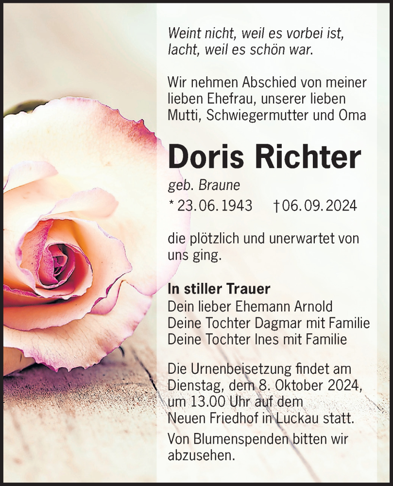 Hier finden Sie alle Traueranzeigen aus der Zeitung, die bisher für Doris Richter erschienen sind. Weitere Traueranzeigen, die in der Zeitung erscheinen, werden hier ebenfalls aufgelistet