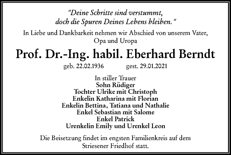 Hier finden Sie alle Traueranzeigen aus der Zeitung, die bisher für Eberhard Bernd erschienen sind. Weitere Traueranzeigen, die in der Zeitung erscheinen, werden hier ebenfalls aufgelistet